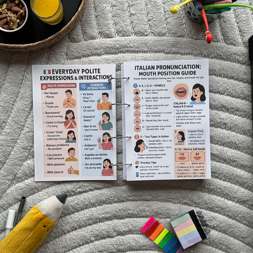 Our Italian learning notes break everything down in a logical, easy-to-follow order. From greetings to grammar, each section builds on the last, helping you learn faster without feeling overwhelmed.